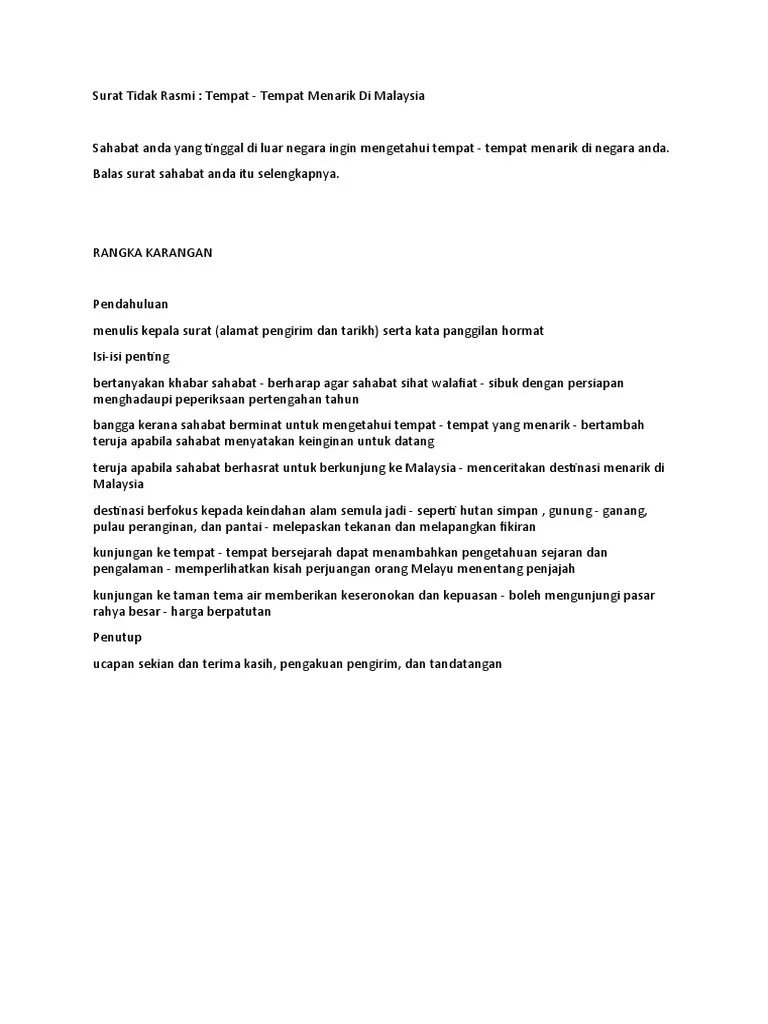 Karangan Surat Tidak Rasmi Tentang Tempat Menarik Di Malaysia / Contoh Karangan Surat Tidak Rasmi Tentang Percutian Otosection. 10 contoh surat bisnis dalam bahasa indonesia alinea lamaran amplop lamaran bank bri amplop lamaran ditulis apa amplop lamaran kerja ke hrd amplop lamaran via pos amplop lamaran yang benar amplop untuk apa … Contoh surat lamaran kerja swalayan yang berisi tentang contoh surat lamaran kerja cara membuat surat lamaran pekerjaan contoh cv dafta. A) maslow keperluan manusia boleh dikategorikan kpd 5 jenis yg boleh disusun … Anda perlu menulis lima hingga enam isi dalam setiap karangan, tidak termasuk Warisan tidak ketara minggu ketiga ini saya memulakan latihan industri di tempat yang baru iaitu di jabatan warisan negara ekoran daripada masalah yang tidak dapat dielakkan. 01.05.2012 · kemudahan pelabuhan yang ada di pelabuhan melaka juga turut menyumbang faktor kegemilangannya. Baca versi flipbook dari buku teks bahasa melayu tingkatan 1. Saya dibawa oleh pegawai …